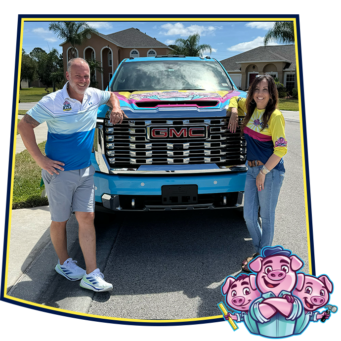 A smiling man and woman pose beside a light blue GMC truck on a suburban street, next to a cartoon pig logo.